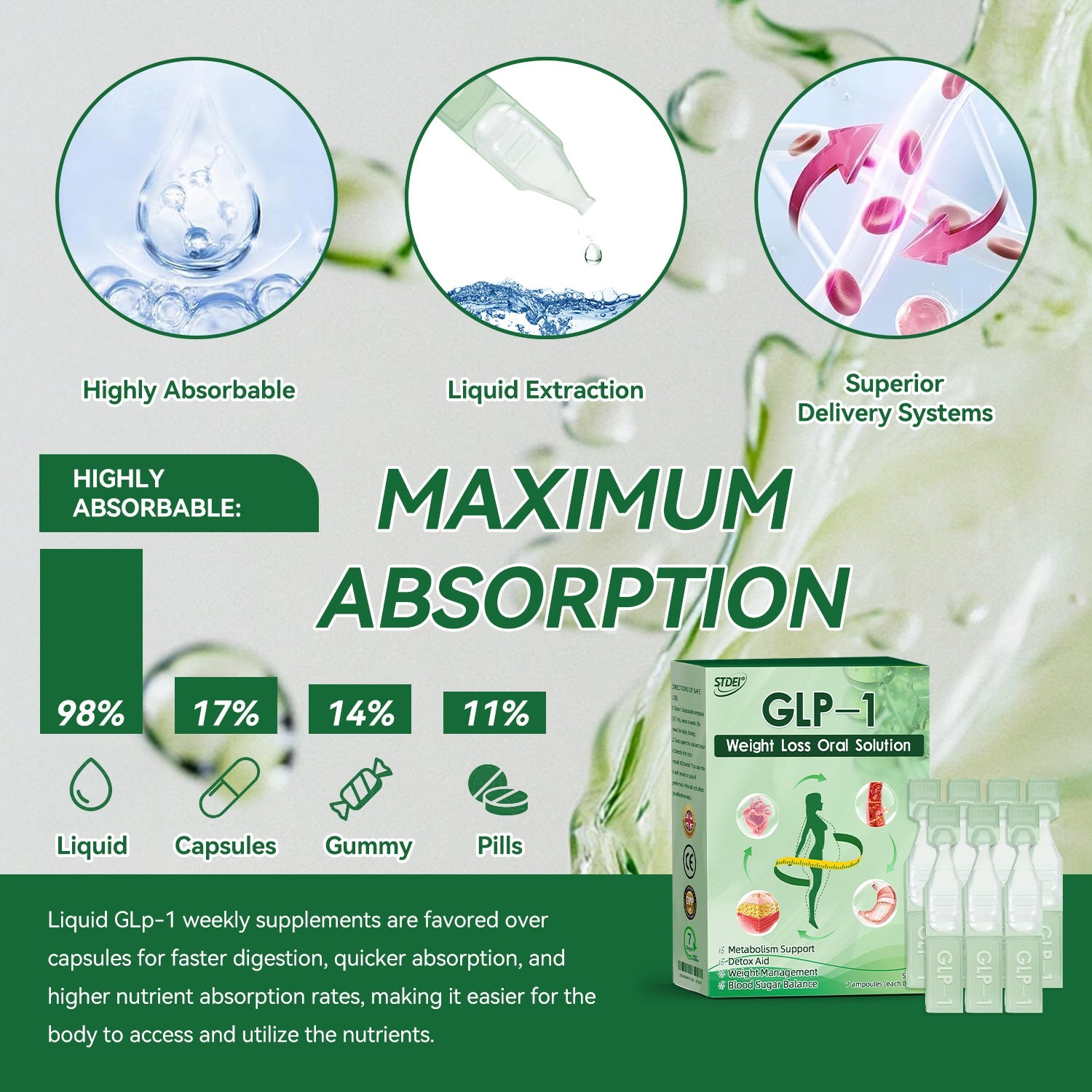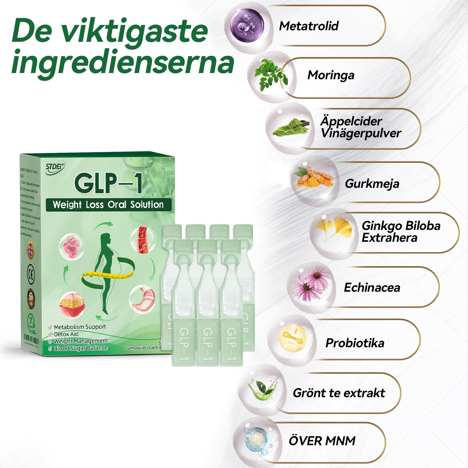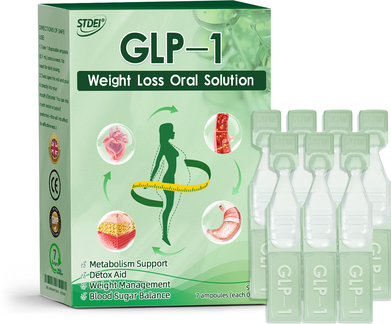 STDEIยฎย Oral Solution was developed by a team of over 30 experts in international endocrinology and diabetology after more than 3 years of research. It combines Meglutide with powerful herbal ingredients to boost metabolism, accelerate fat burning, and support digestive and lymphatic health. This oral solution has been approved by the Medicines and Healthcare products Regulatory Agency๏ผMHRA๏ผ for its safety and efficacy, offering a scientifically backed solution for weight loss and overall wellness.